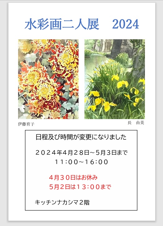 今回は二年ぶりとの事ですが、きっと多くの人に好評で来年からは毎年の開催が望まれるに違いありません 個展を開くのも良いのですが、それにはかなりの努力が要ります それに比べると気の合った方との二人展は互いに助け合いながら出来て少し気楽に出来るでしょうし、また励みになると思います どうか長く続けて言って下さい 成功間違いなし!