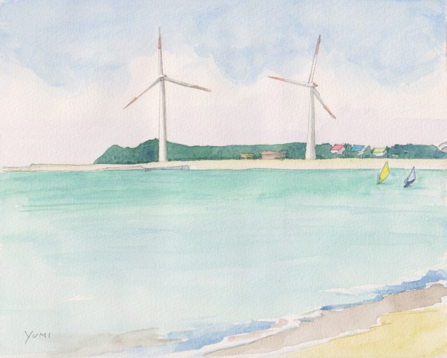 エメラルドグリーンの海に黄色と青のセイルが映えて気持ちの良い作品ですね。