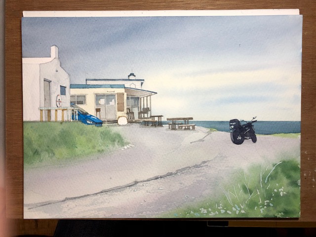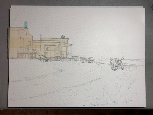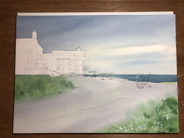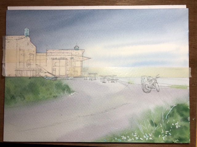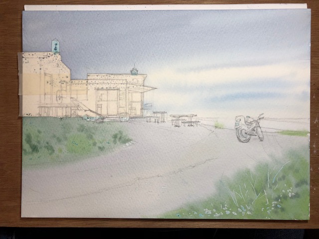 左側の草むらに少しマスキングインクで草を描き込んでから