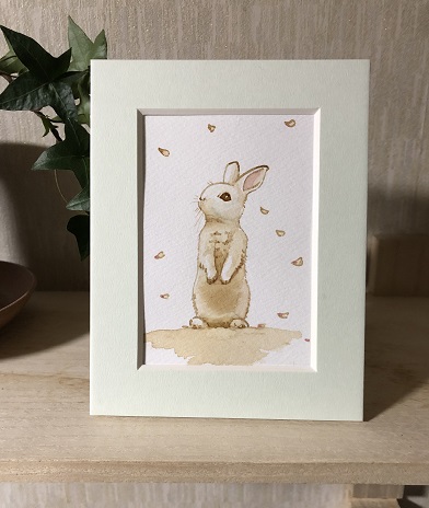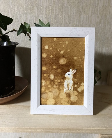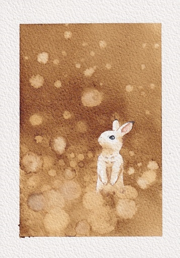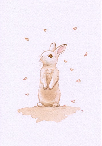 桜舞い散る中にいるうさぎです。(ピンクの絵の具使用)ホワイトワトソン