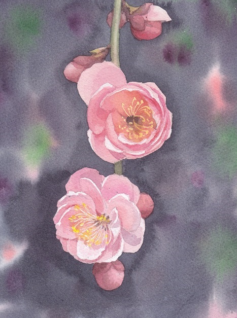 春を予感させる梅の花、二輪だけなのに画面が寂しくありません 堂々として重量感があります 花の雄しべも繊細に描かれていて隙のない絵です 背景の複雑な色彩は流石yumiさん!