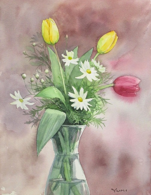 黄色の花がきれいで茎も優しい感じの曲線でとても素敵です!マーガレットの白もとても美しいですね!先日わたしの行っているお教室でもチューリップでしたが力が入りすぎて葉っぱばかり大きく描いてしまいました(笑)