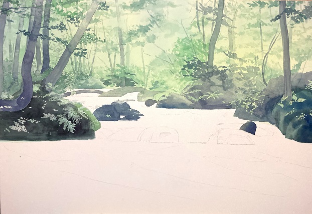 さて今回の途中画ですが、もう素晴らしい作品だと言う事が分かります 手前の方は水の流れになるのでしょうね ブルーシートを敷いて描いておられる様子を想像すると大変さが身に沁みます