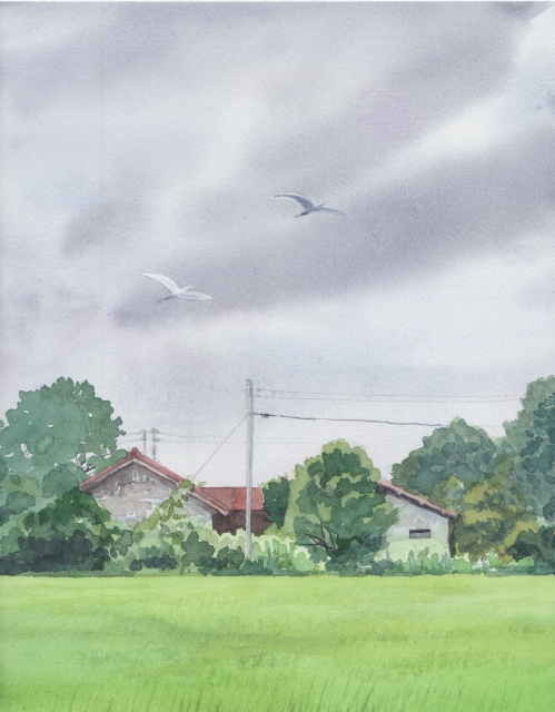 白鷺を入れたのが大成功です 少し雲行きが怪しそうなので白鷺は急いでねぐらに帰る所でしょう
