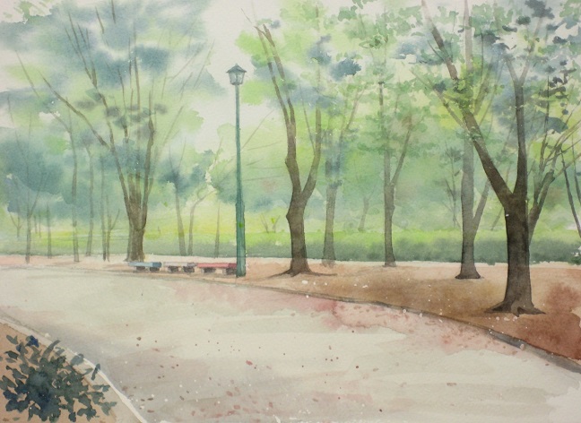 さてこの絵、季節感が無いと言われますが、秋雨の前のもやっとした空気に包まれた樹木がもうすぐ紅葉しそうな感じでとても良いと思いますよ