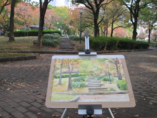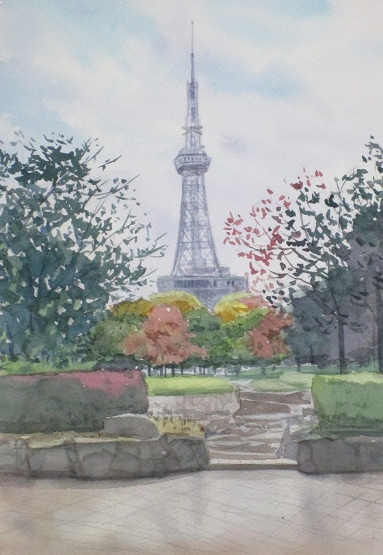 タワーのある絵は先ず空が気持ち良いです 又樹木の紅葉した一枚一枚の葉の筆遣いが流石です