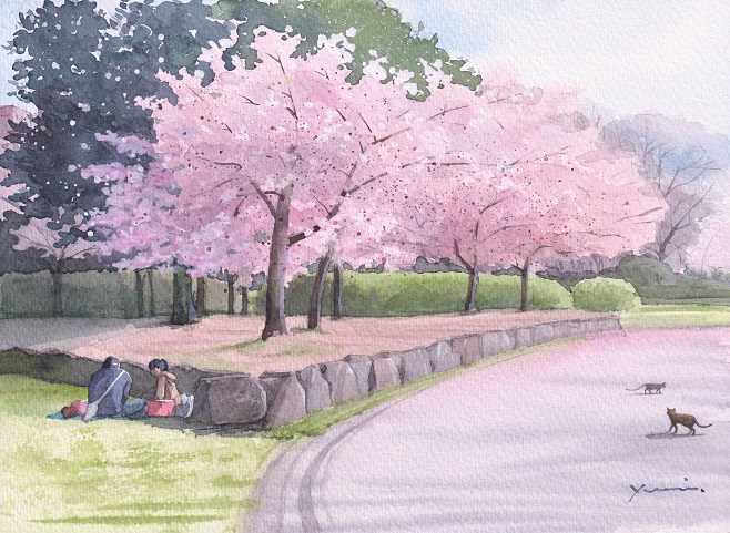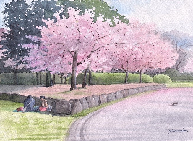 桜の描き方も勿論素晴らしいですが、石垣が上手いですし、ぐっとカーブした道の配分がとても気持ちいいですよ