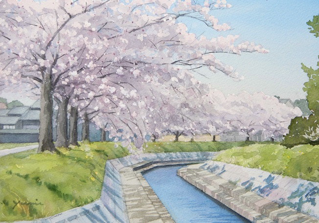 何故かとよく見たらそれは周りの緑や水の青さがきれいだからと気付きました 実際の景色は少し薄汚れています また用水路が曲がっている構図も流石です 絵全体が右に流れるような気持ちよさがあります