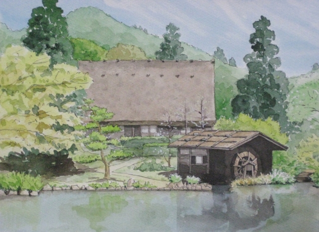 の陽ざしの中で水車が回っていてわくわくする様な躍動的な感じがします。二枚目は初夏の緑