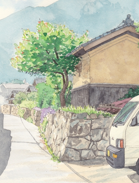 真ん中のザクロの木がしっかり描きこまれているので、石垣や蔵が良いと言っても主役を食ったりはしていません