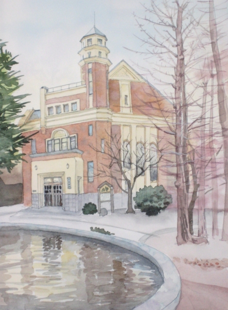 建物に変な所が全くないし(私が描くと歪んだり斜めになったりします)、泉の水面は上手すぎるし、濃い緑を配して画面を引き締めているし、羨ましいなァ~
