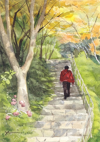 この絵は、坂道の描写も素敵ですし、紅葉も美しくて魅入られます 人の背や石段に注ぐ木漏れ日の感じに感心しました とても印象に残る作品です 私の作品の中で手本にさせてもらおうと思います