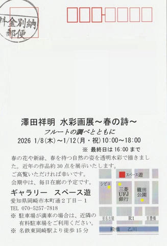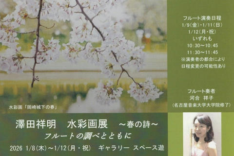 2026/1/8~1/12 澤田祥明水彩画展~春の詩~フルートの調べとともに10:00~18:00(最終日は16:00まで)ギャラリー游 愛知県岡崎市本町道2丁目-1