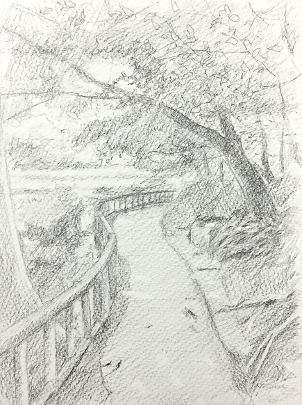 全体の光と影の部分のほかに木々の葉を斜めの線で