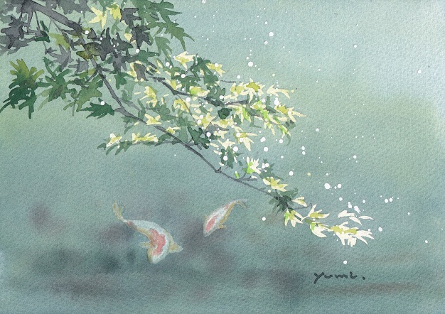 さてこの絵ですが、これぞ本物の画家の本当の絵です(表現が幼稚ですね) 特に感心した点は構図の取り方、枝が右下がりになっているのでその下に水面が広がって見えます 池を表すには水平線を描くのが普通なのにこのように全面水面にしても池を感じさせる所が凄いです 鯉は水の中で泳いでいます、輪郭のぼかし方が絶妙だからです きっと欲しい人が一杯います
